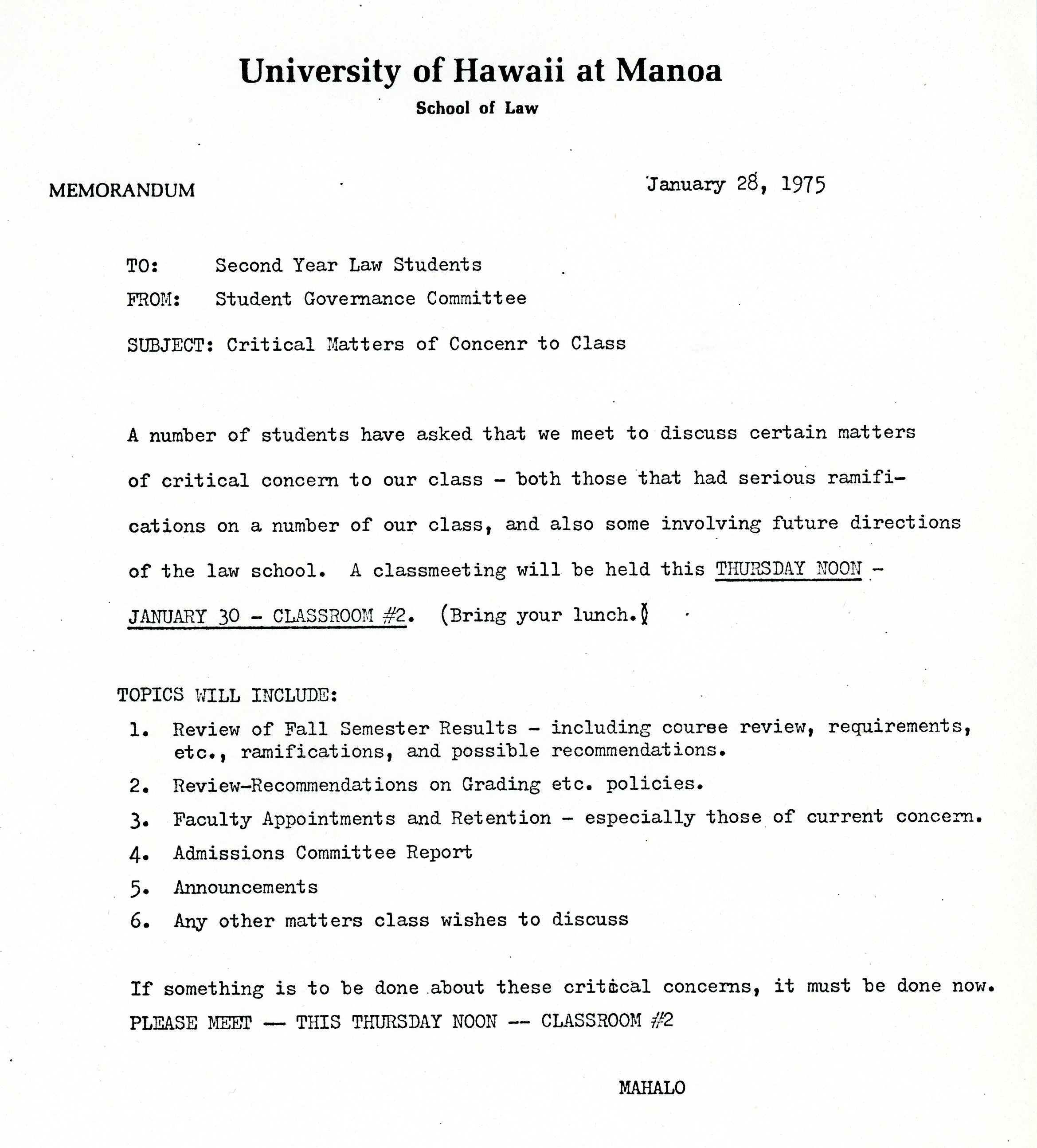 In July 1975, Mimi Durant and Susan Connor-Lum wrote to both classes that their proposal for student input the the Dean Search Committee had been dismissed by the UH Acting Chancellor. Mimi and Susan urged our input.  Tom Kaulukuki and Carol Quindara eventually were appointed as such class representatives, as noted on a September 1975 memo.